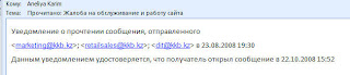 Интересно… Уведомление пришло с адреса marketing@kkb.kz. Два месяца… До Аляски посылка идет 10 дней Казпочтой(!). Похоже, что адрес был заведен так, для галочки… Дабы наивные клиенты отправляли письма «на деревню дедушке».